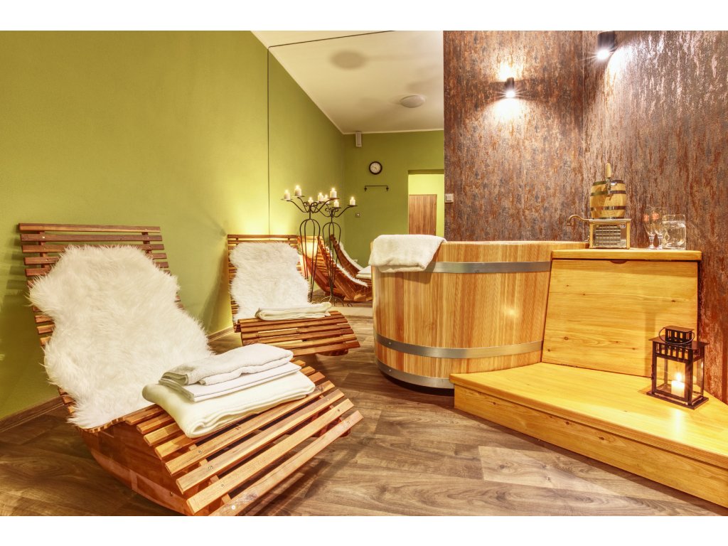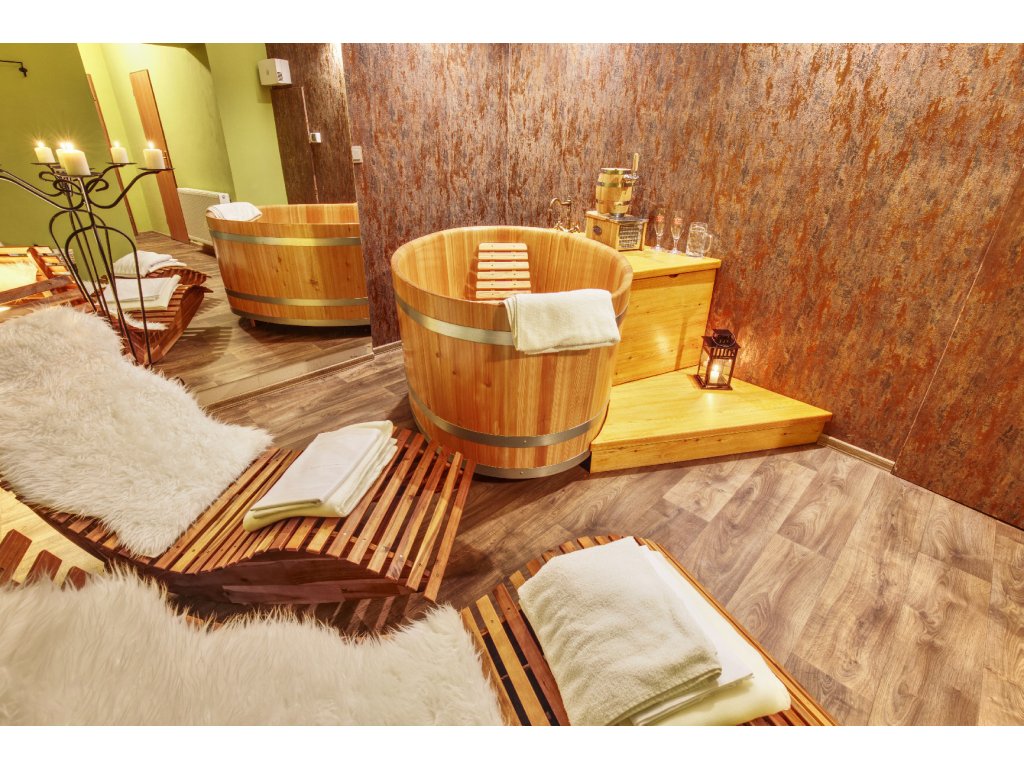 - 20 minut koupele v dubových a modřínových vanách + 25 minut odpočinku na relaxačním lehátku (nebo dle uvážení hostů)
